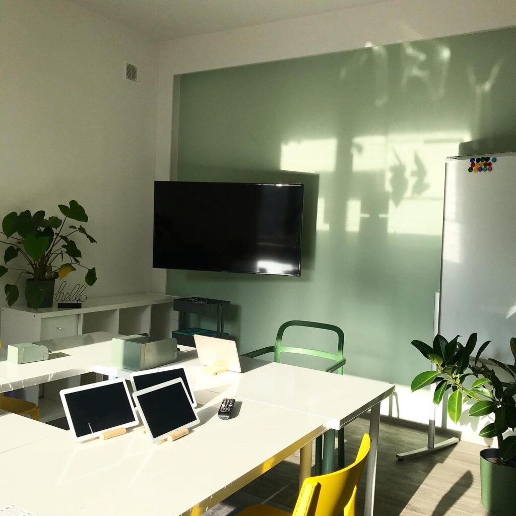 Uczymy interaktywnie z użyciem najnowszych technologii i platform do nauki, nasze studio wyposażone jest m.in. w tablety dla słuchaczy. Młodzież swoje telefony zostawia w koszyku, tak żeby z jednej strony mogli się skupić, z drugiej korzystać z wirtualnych gier i zabaw na zajęciach.